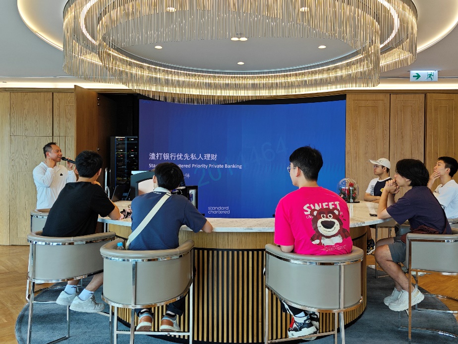 8月14日上午,同学们来到渣打银行交流参观。渣打银行高级优先私人理财客户经理王俊迪为同学们介绍了渣打银行的主要业务,并讲解了股票、国债及国际货币等投资知识,结合当前国际形势,特别是美联储的加息或降息政策,分享了如何灵活调整投资策略,如加仓或回调,以应对市场变化。