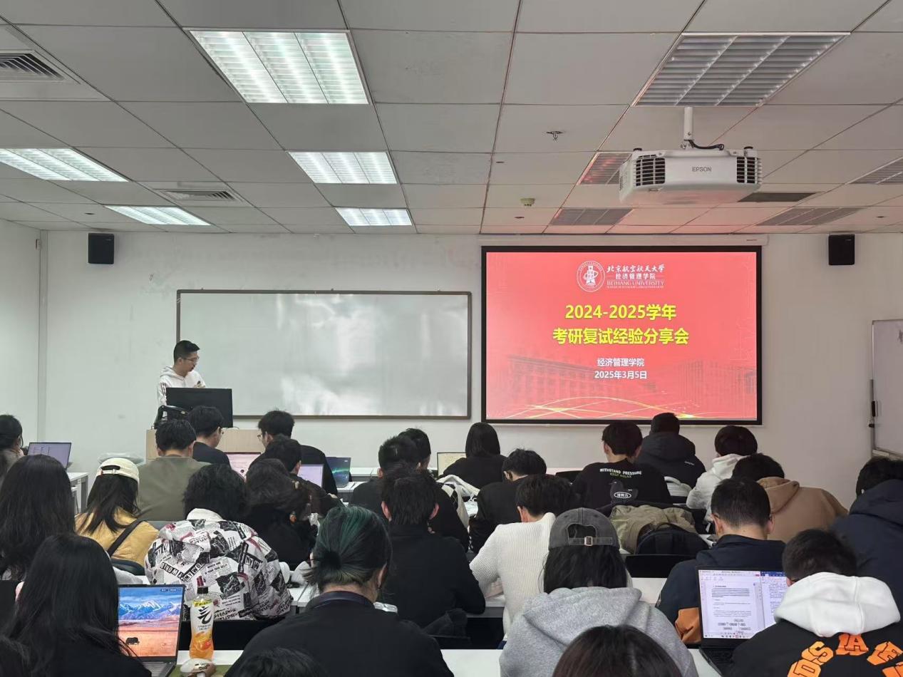 新学期伊始,为助力考研学子调整学习状态,形成更科学有效的学习规划,经济管理学院“尚学”学业支持与发展中心联合生涯服务中心,于2025年3月5日下午在学院路校区新主楼A1028教室组织了一场考研复试经验分享会。此次分享会特邀曹方煜、邢文超、陈佳怡、姜泽凯、张慜五位优秀的学长学姐,聚焦复试核心环节开展经验分享,100余人参加本次分享会。