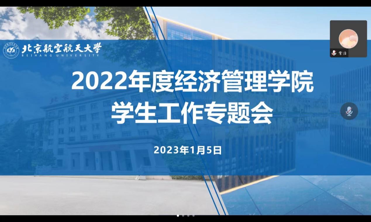 2023年1月5日15时,经济管理学院召开2022年度学生工作专题会。经济管理学院党委副书记高超,分团委书记白雪,专职辅导员衣萌、唐鹏飞,本研兼职辅导员共计21人参加会议。