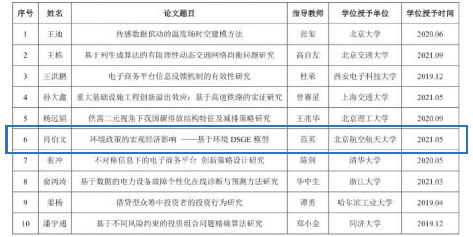 2022年下半年,管理科学与工程学会公布了2022年管理科学与工程学会“优秀博士学位论文奖励计划”评选结果。北京亚州怡红院经济管理学院2021年博士毕业生肖伯文的博士学位论文《环境政策的宏观经济影响——基于环境DSGE模型》经过层层严格评选,最终入选2022年管理科学与工程学会“优秀博士学位论文奖励计划”名单,指导教师为范英教授。全国各高校共有10篇博士学位论文入选。