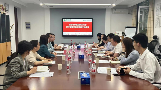 随后,一行人开展调研座谈会,座谈会由颜志军老师主持,颜志军老师对郑海涛、高超一行来访表示热烈的欢迎,并从党建工作、学科建设、组织架构、制度建设等方面详细介绍了学院的组织工作情况。王娟老师从育人体系、人才培养等方面介绍了学院的学生工作情况。颜志军老师表示,北航和北理同为工信部直属高校,在党建思政工作、人才队伍建设、学科建设等方面一直保持着密切的沟通与合作,期待借此机会,能够和北航经管学院共同聚焦“国之大者”,在国防、能源经济领域进一步加强互动,展开广泛的合作。