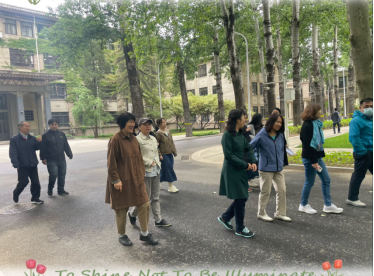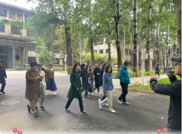 随后,队伍兴致高昂地启程,沿着校园幽静的步道进入教学区内漫步,感受春日的温暖和校园的生机。行进中,老师们信步逐一走过主楼广场、图书馆等地点。平日上课匆匆而过的教学楼、花园小径,大家此时此刻放慢速度用心去观赏和品味。大家一边欣赏美丽的校园风光,用双眼和相机记录春日美景,一边相互交谈,分享各自的教学经验和生活趣事。在轻松愉快的氛围中,大家不知不觉就到达了活动的终点—— 绿园荷花池的小石桥。