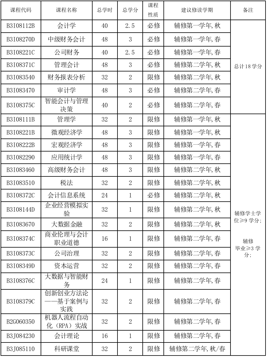 取得辅修专业修读资格的学生,可在选课期内按照已选的辅修专业培养方案进行选课,所有课程均在学院路校区开课,具体课程设置及学分安排请见附表,辅修专业不得中途更换。