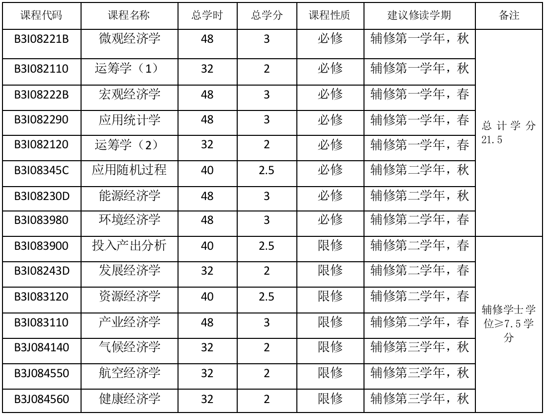 附表:经济管理学院辅修专业最低总学分及课程要求