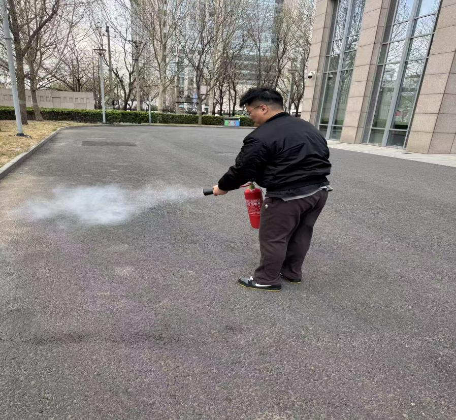 此次消防演练开始时,由报警员李辉勤模拟发现A701房间有火情后,第一时间按动楼道手报按钮,同时拿起电话拨打物业中控室电话“82339090”报警:“新主楼A座701房间发生火情,请速来扑救。”火灾初起时李辉勤同学就近拿起灭火器进行灭火扑救。